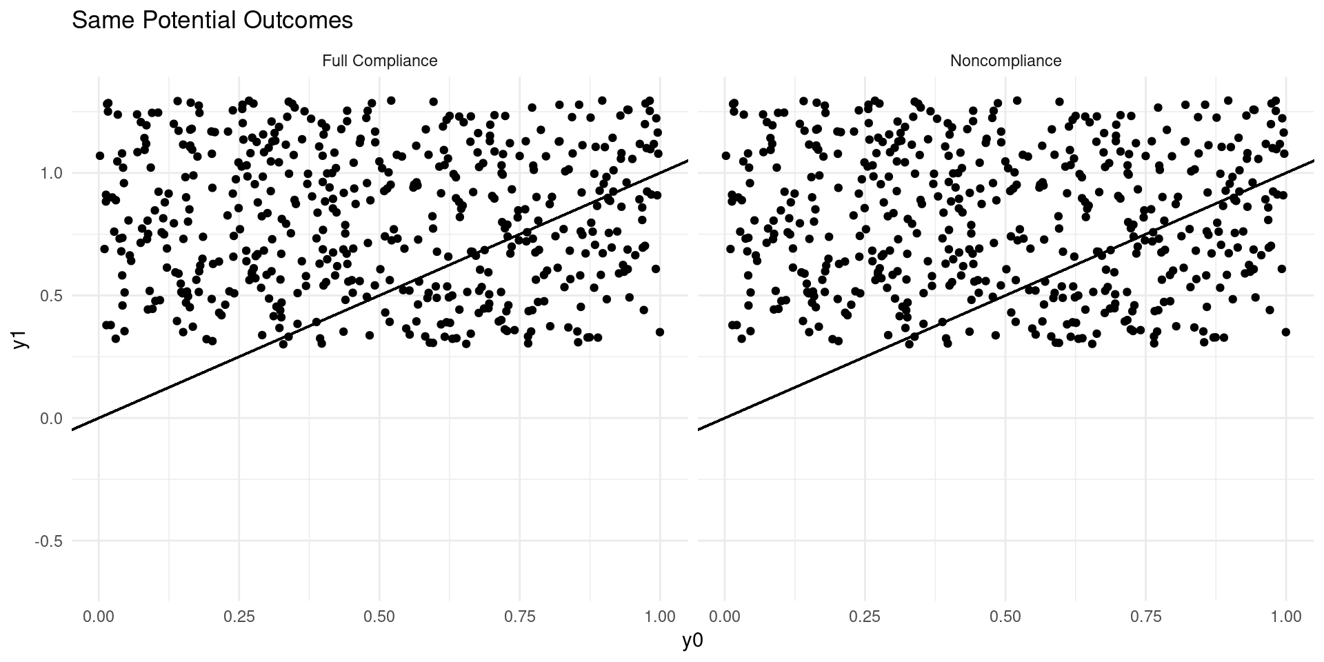 Now suppose that a tuition subsidy of \(\tau\) is randomly offered to some, \(Z\in\{0,1\}\), so that: \[ D_{Z} = \mathbf{1}\{Y_{1} - Y_{0} \geq C - Z\tau\} \]