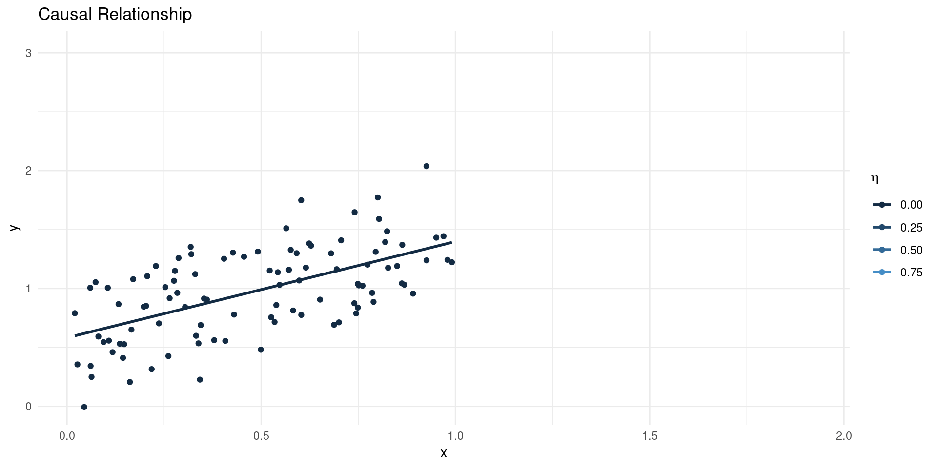 Now suppose the true model of outcomes is \[ Y = \gamma_{0} + \gamma_{1}X + \eta \]