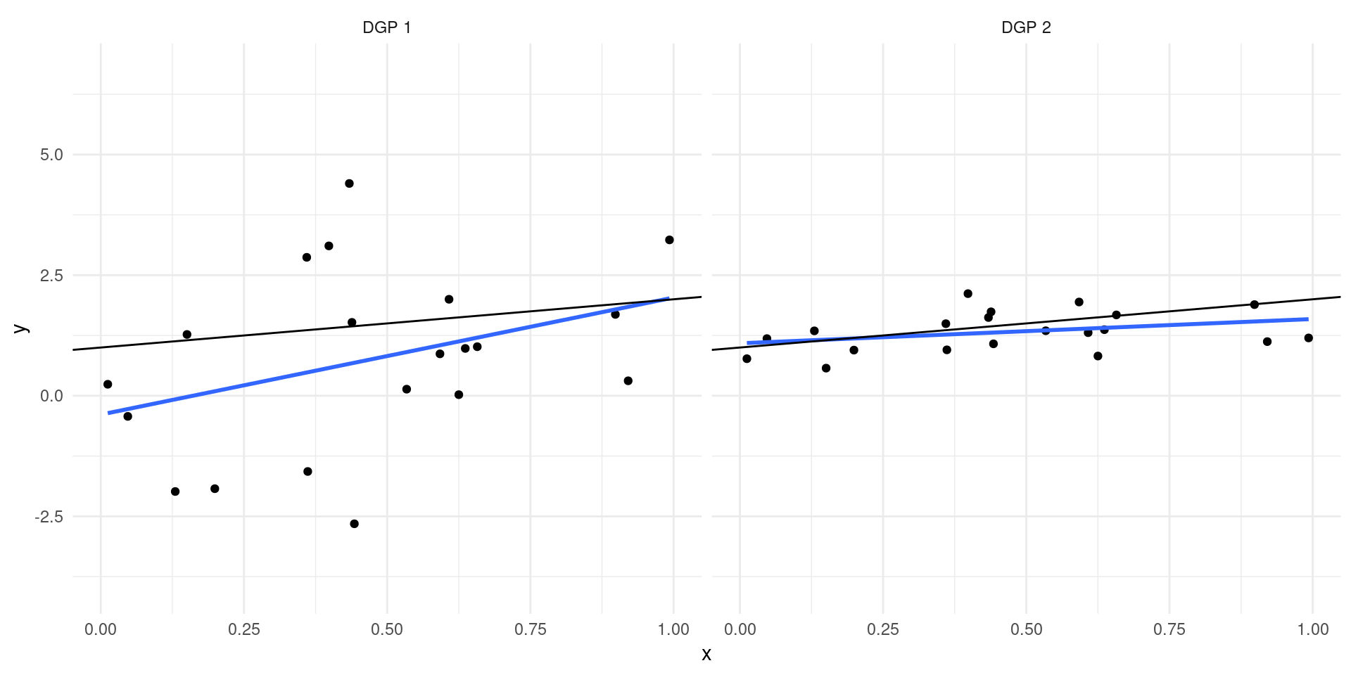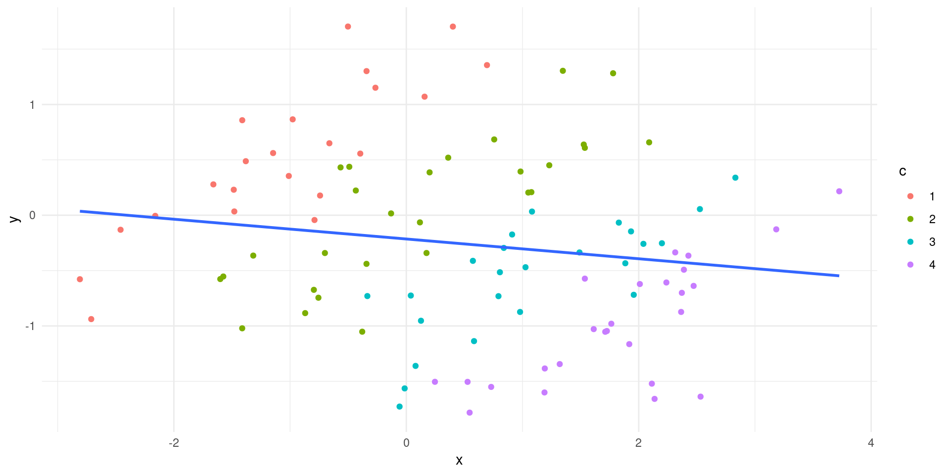 \[ Y = 2 + 0.5X - c + \epsilon,\qquad X \sim \mc{N}(c-2,1)\]