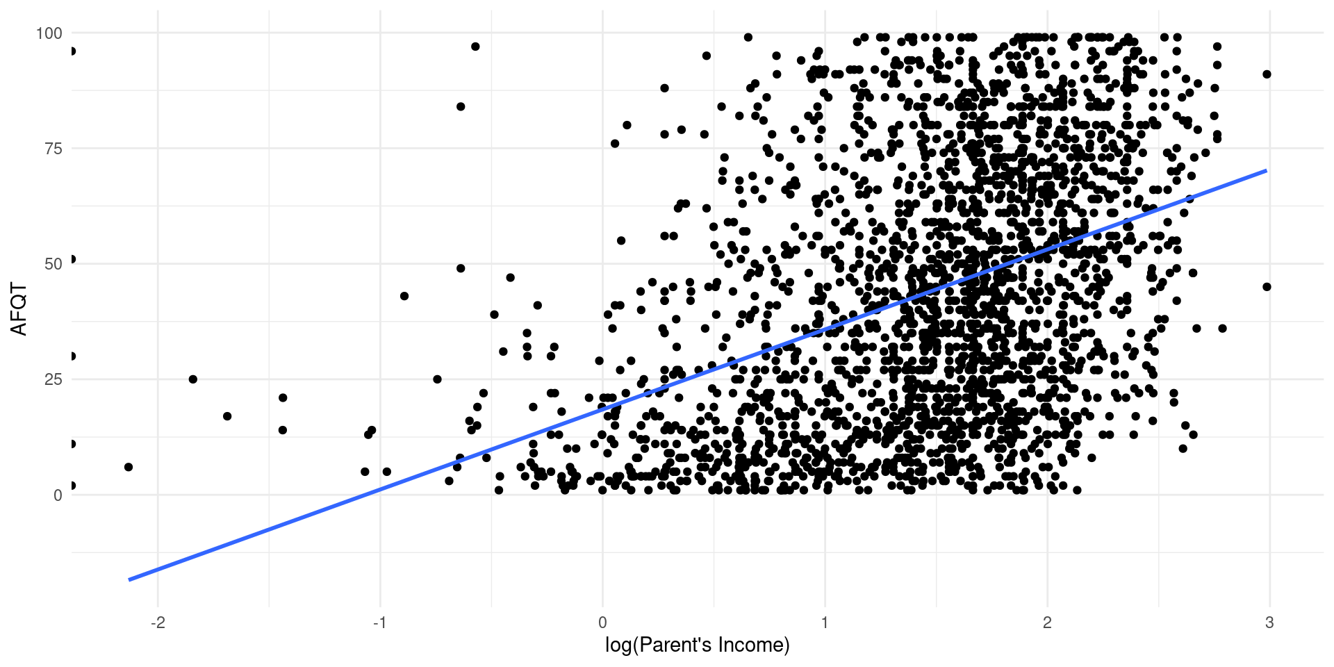 lm(formula = afqtrev ~ log(mfinc1617), data = .)